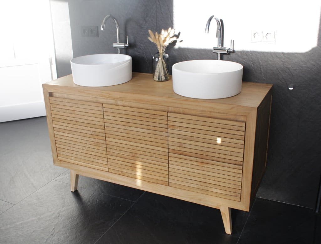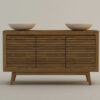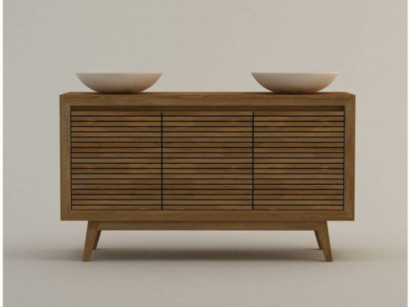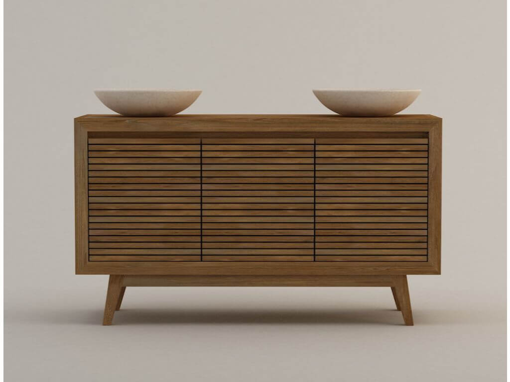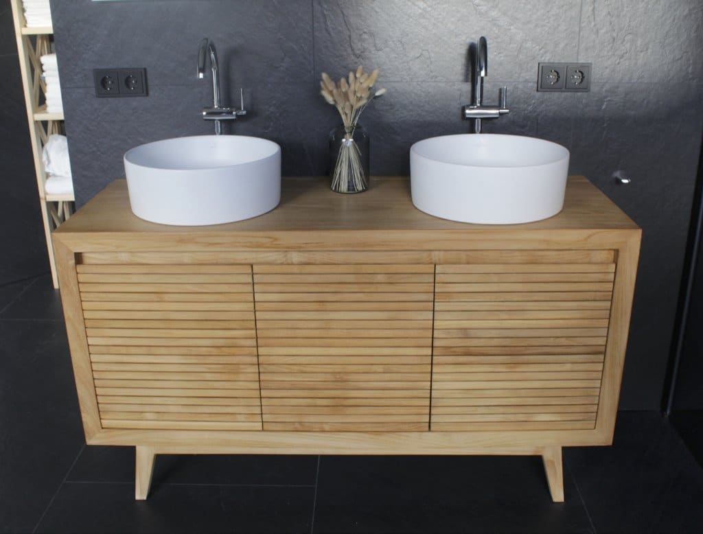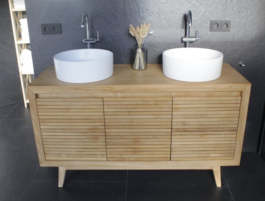 Unser Doppelwaschtisch Turin 27 aus Teakholz Massiv wird Ihnen gefallen, wenn Sie sich mit Ihrem Partner das Badezimmer teilen. Der Doppelwaschtisch hat hinter den drei Türen reichlich Stauraum für alle Ihre Badeutensilien. Auf der Abdeckung ist reichlich Platz für zwei Waschbecken, sodass Sie sich nicht ins Gehege kommen, wenn Sie es morgens eilig haben.